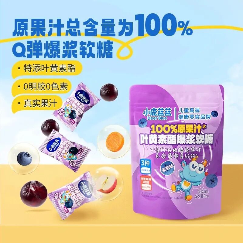 母婴赛道的新锐品牌小鹿蓝蓝,则主打天然健康牌,其叶黄素酯软糖原果汁总含量达100%,以Q弹爆浆的口感和0明胶、0色素的配方,精准击中母婴群体的消费痛点。
