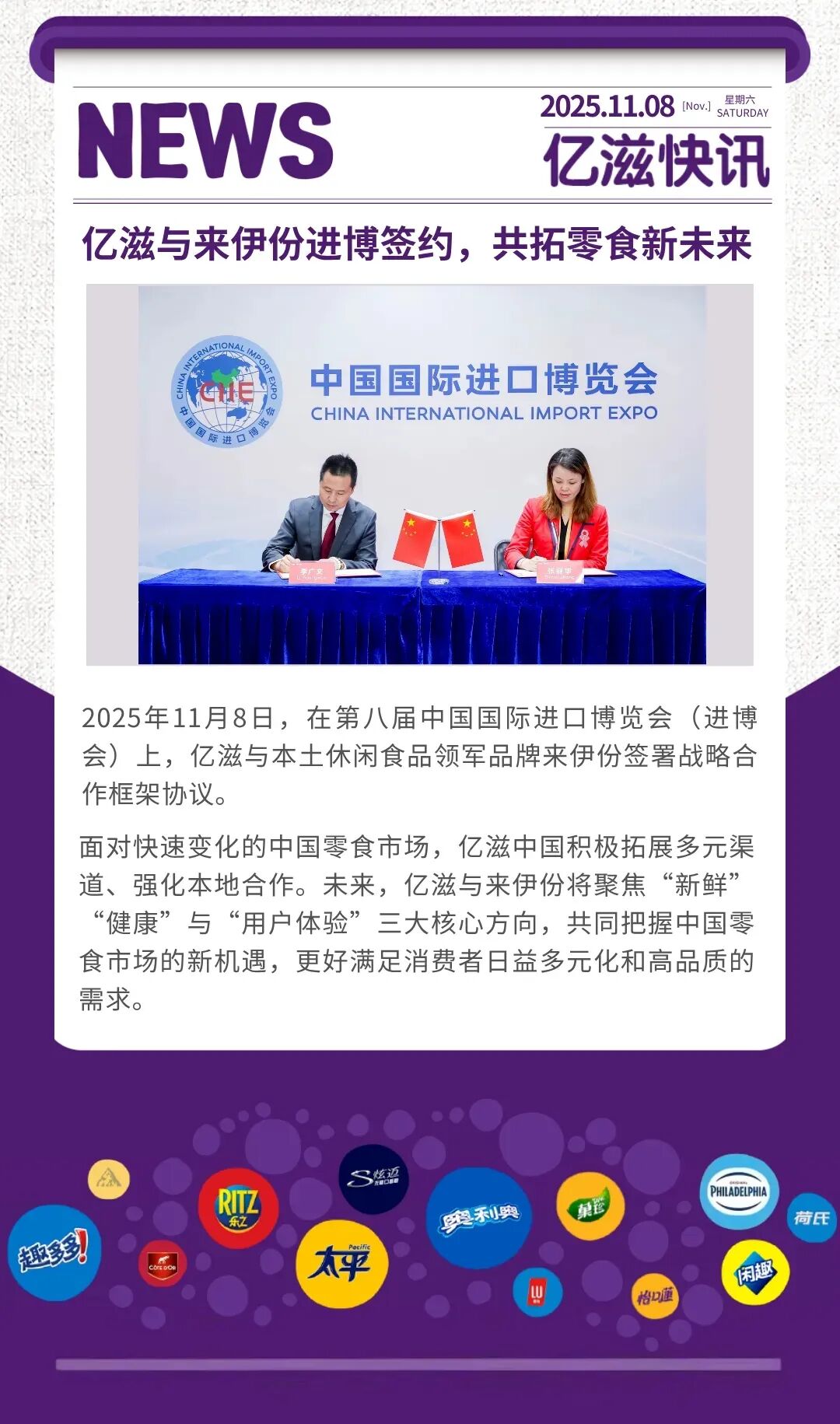 而在中国市场,亿滋也对渠道端颇有研究和策略。不久前,在进博会上与来伊份签署战略合作框架协议。双方将聚焦“新鲜”“健康”与“用户体验”三大核心方向,携手拓展多元渠道,强化本地合作,以更好地满足中国消费者多元化、高品质的消费需求。