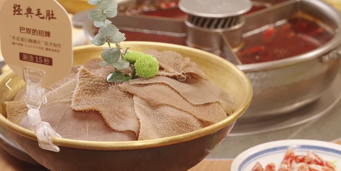 “毛肚+菌汤”是巴奴的招牌组合。据其介绍,毛肚采用更健康的木瓜蛋白酶技术发制,甚至远赴新西兰牧场获取优质食材;菌汤则严选云贵高原野山菌,坚持门店每日现熬,4个小时用不完就倒掉。